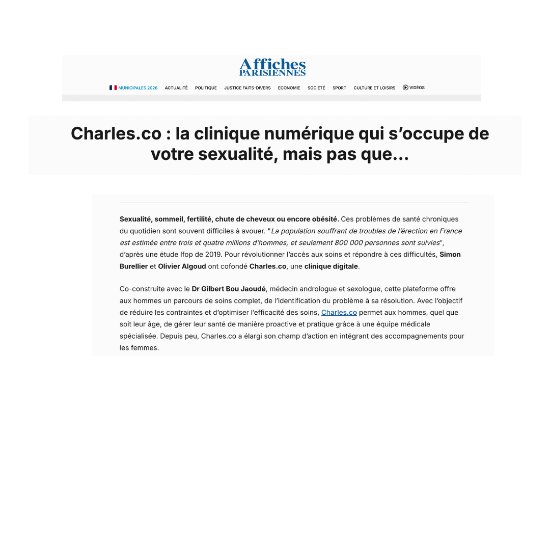 Charles est une clinique digitale dédiée à la santé masculine et à la prise en charge de l’obésité, proposant un accompagnement médical personnalisé via téléconsultation. La plateforme associe expertise de médecins, traitements adaptés (dont les analogues du GLP-1 si éligible) et suivi dans la durée pour des résultats concrets, accessibles et encadrés.